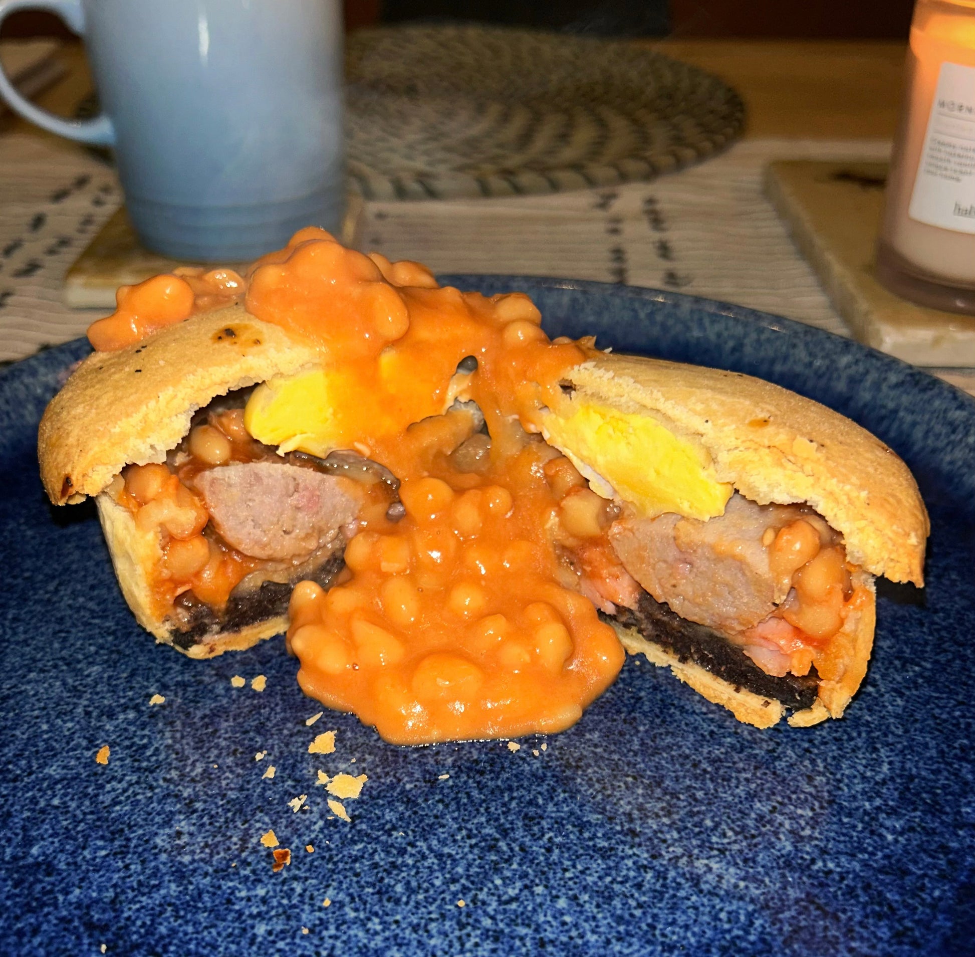 This pie is layered with Bury Black Pudding, Butter-fried Mushrooms, Smoked Gammon, Pork Sausage's from Brown's Butchers (Barnoldswick), Free-range Egg and Heinz Beans.