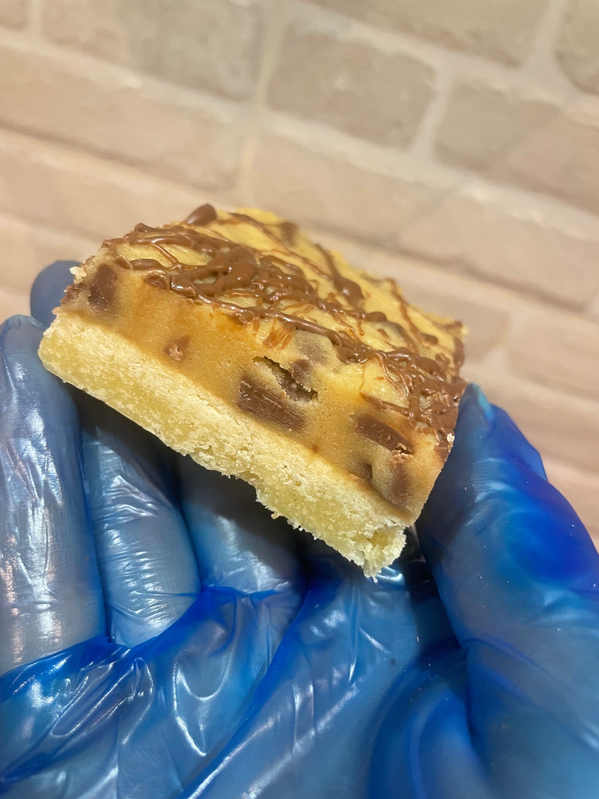 Buttery biscuit base topped with delicious chocolate chip cookie dough and drizzled with milk chocolate