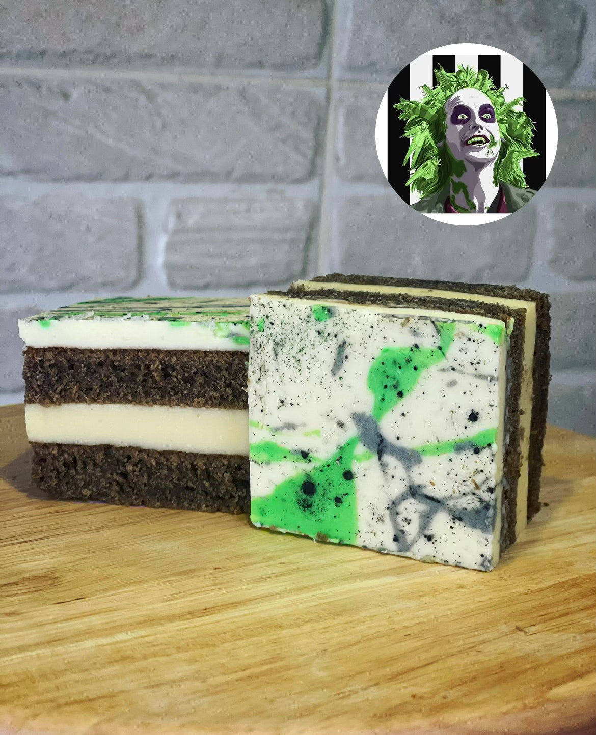 Our delicious chocolate sponge layered with white chocolate and vanilla spread, topped with a Beetlejuice themed design made of vanilla cream and coloured chocolate