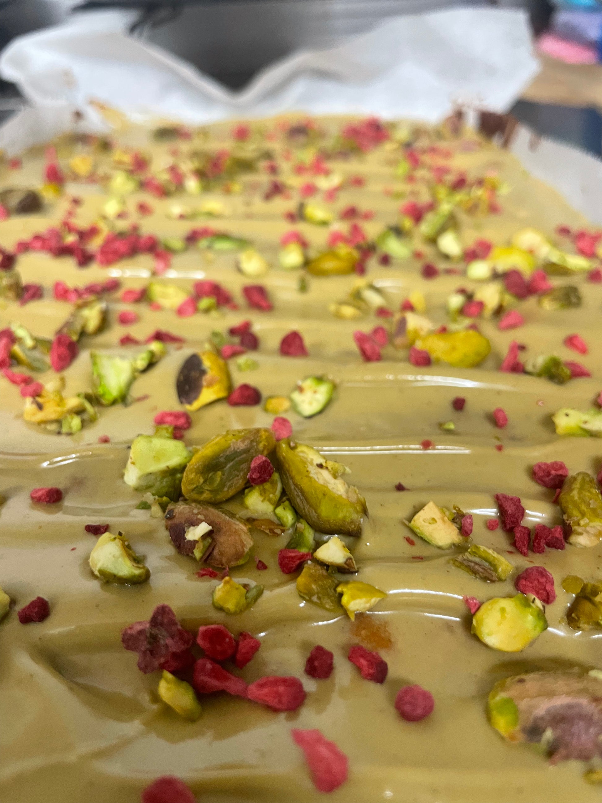 Our classic Blondie Recipe swirled with raspberry jam, Topped with creamy Pistachio spread, pistachio pieces and freeze dried raspberries