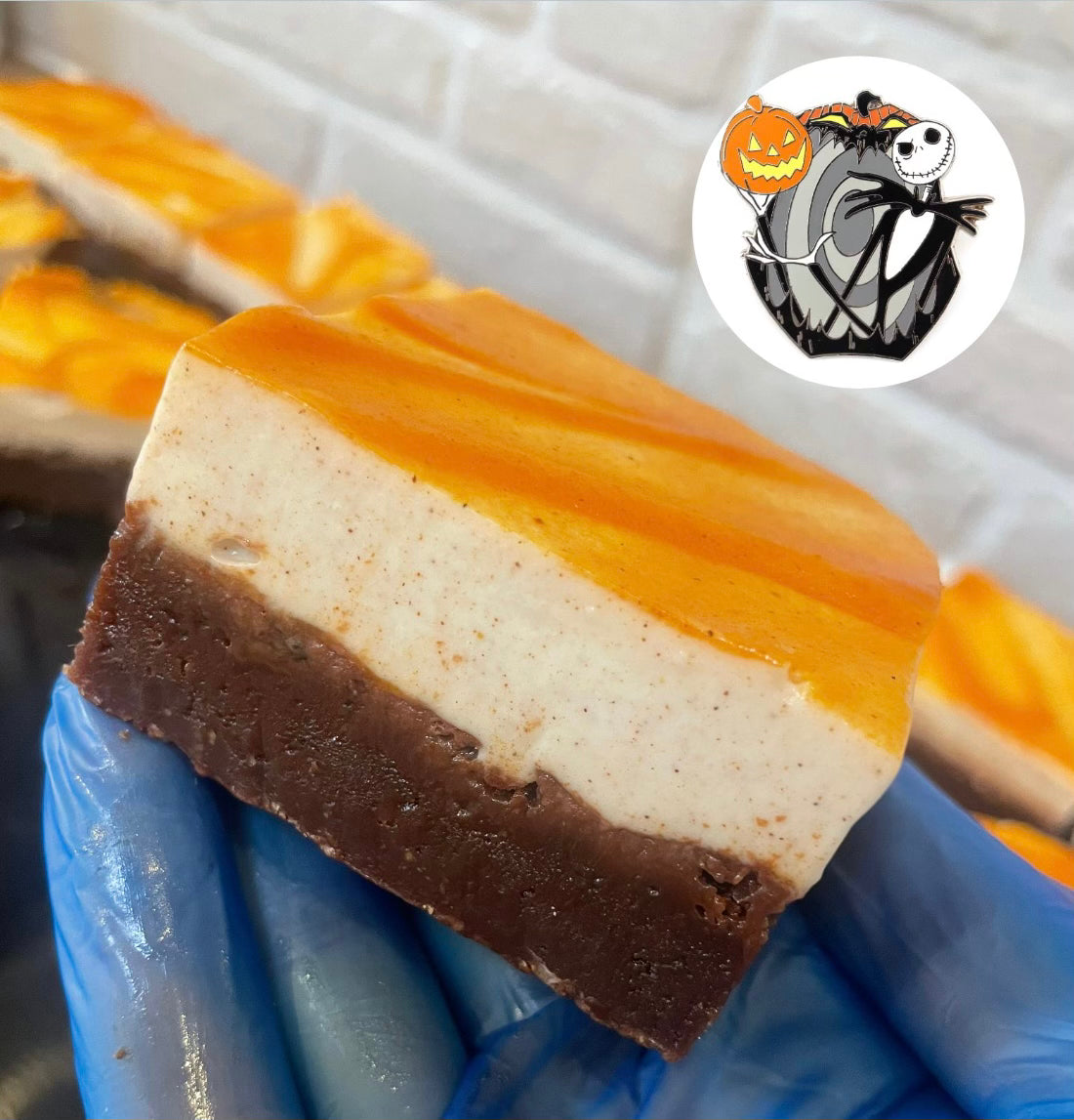 Our classic brownie recipe topped with our creamy pumpkin spiced cheesecake mixtures and topped with pumpkin spiced sauce. Inspired by Jack Skellington, The Pumpkin King