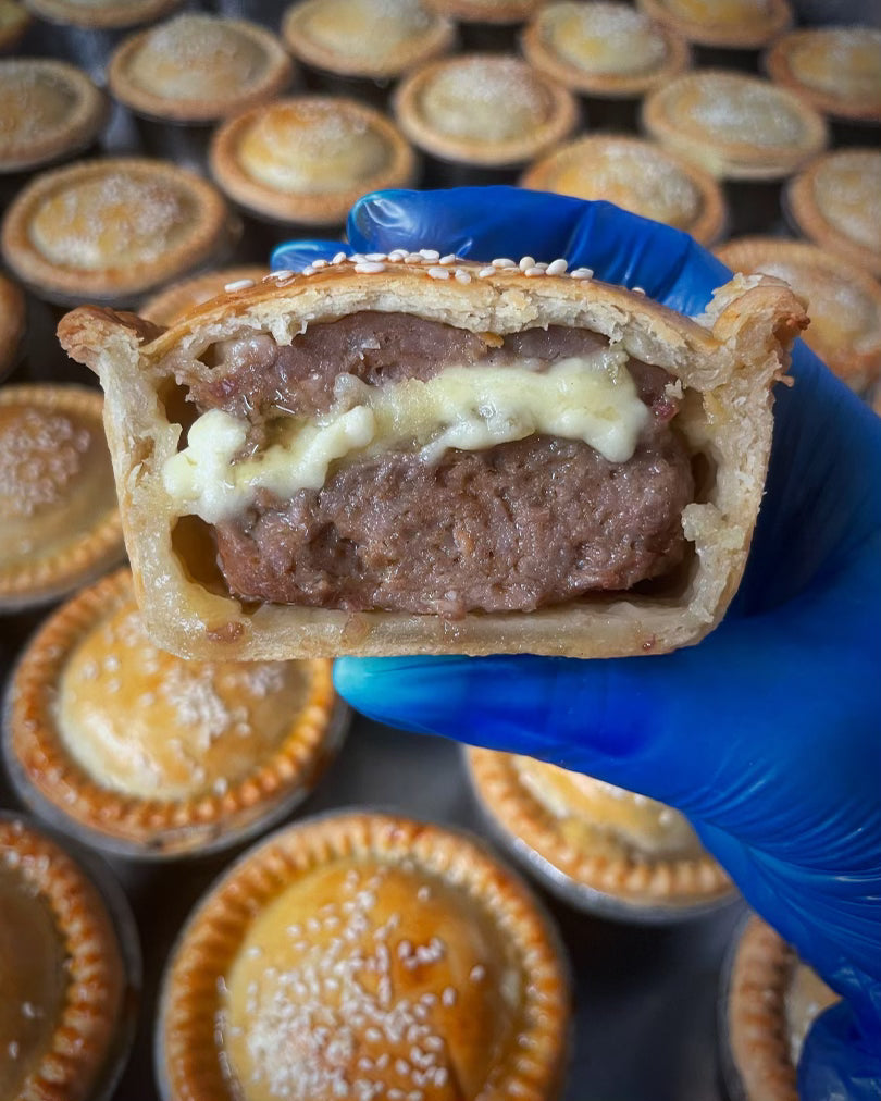 Our Texan burger is created using top-side beef which we mince ourselves, combined with herbs & spices for that slight Texan-kick. Layered with Smoked Applewood Cheese and Mature Cheddar and sprinkled with Sesame seeds, this is literally a burger in a pie!!