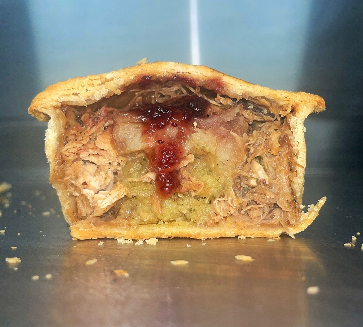 Roast Turkey, Honey Roasted Winter Veg, Sage & Onion Stuffing Ball and Roast Potato in a delicious turkey Gravy and topped with a dollop of Cranberry Sauce.